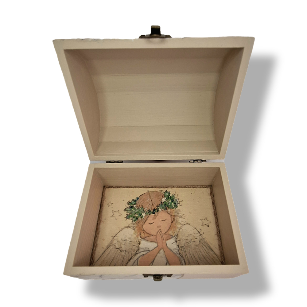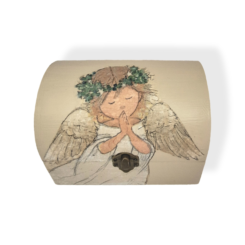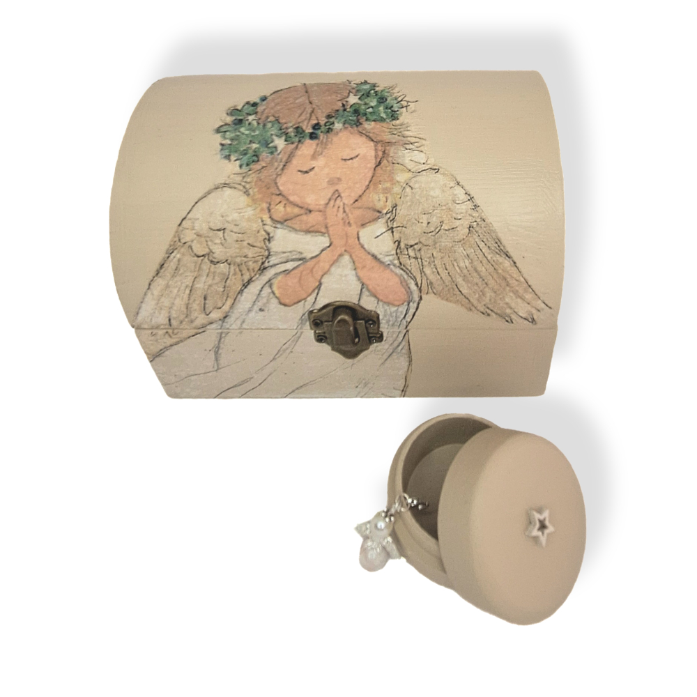 Bijgesloten zit een klein rond houten doosje en een engeltje.