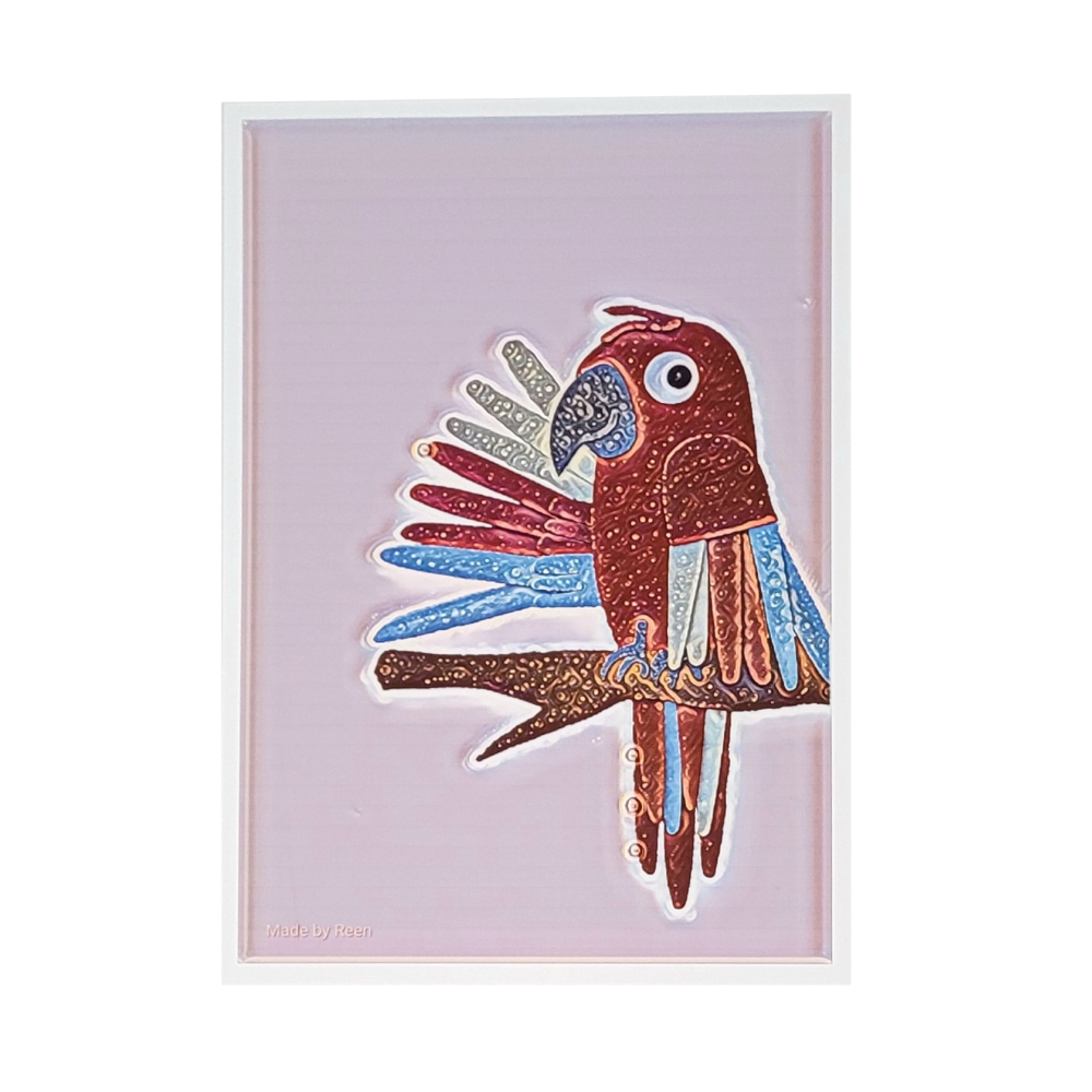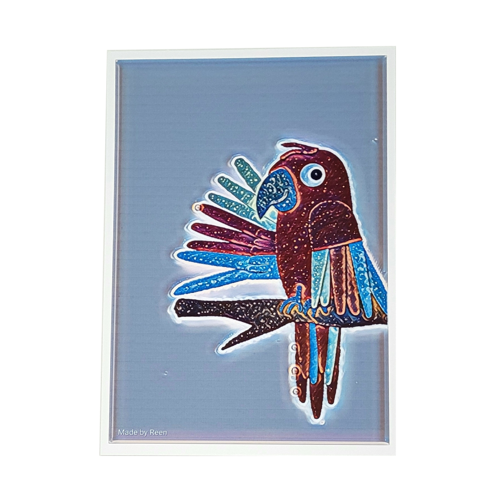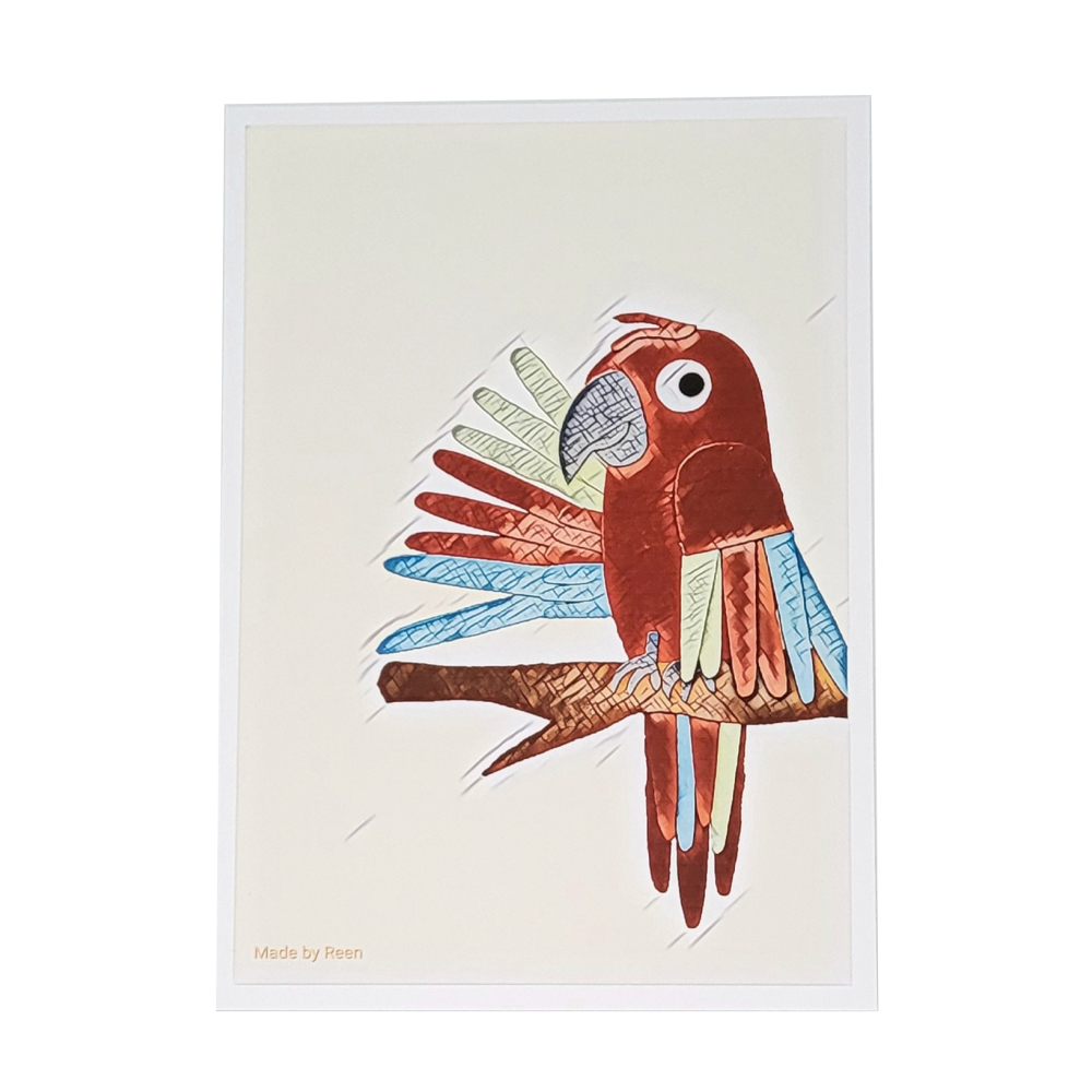Deze kleurrijke papagaai staat op een poster van A4 formaat. In verschillende uitvoeringen verkrijgbaar.