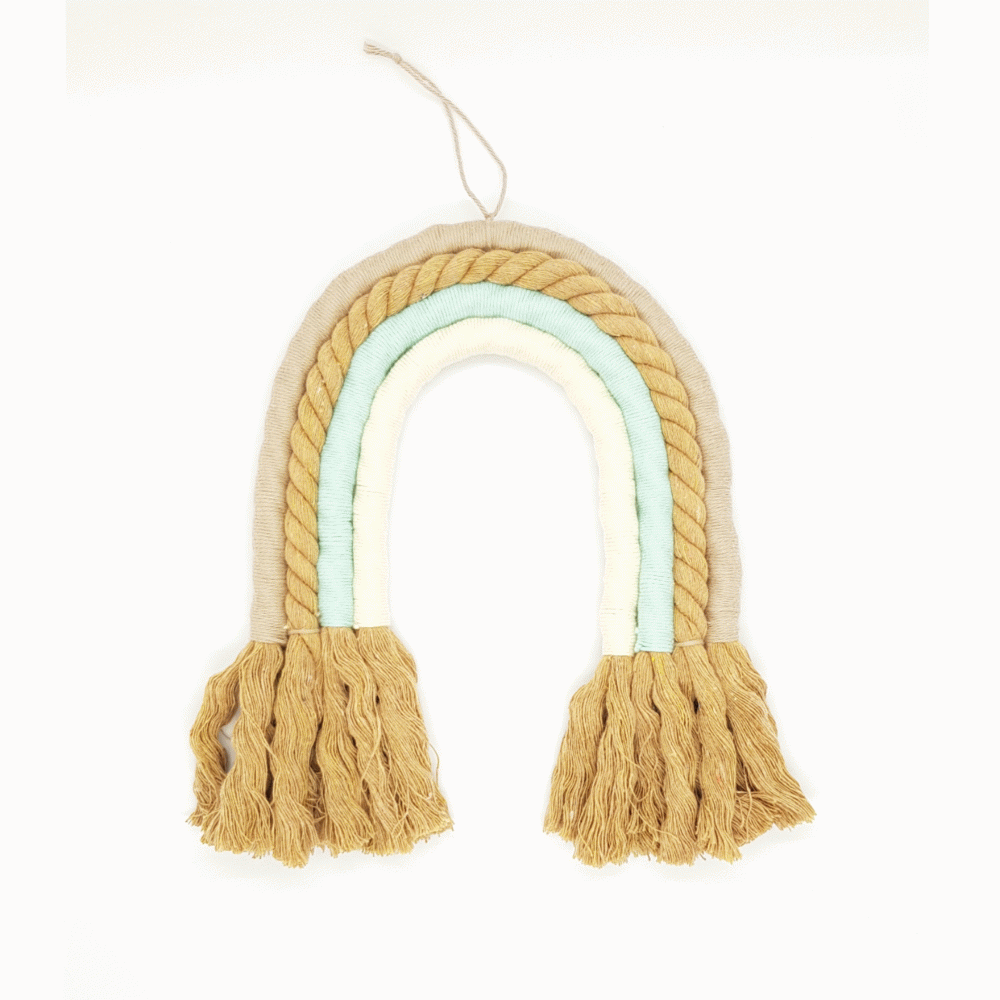 Deze leuke regenbooghanger is van bruin touw in de kleuren taupe, mint en off white.